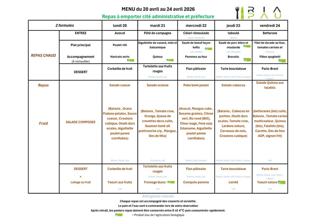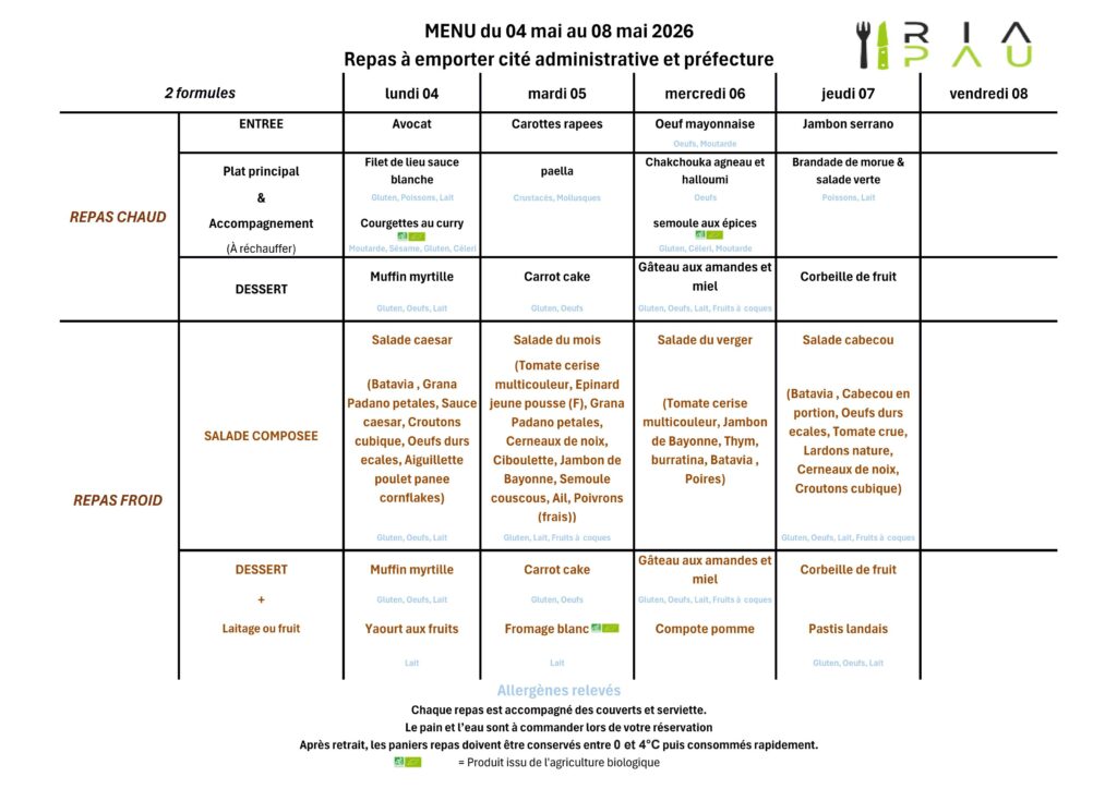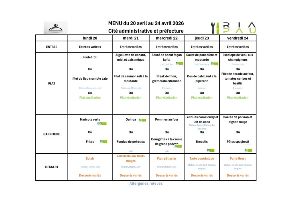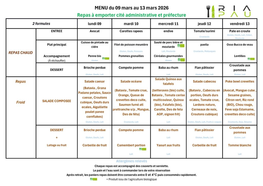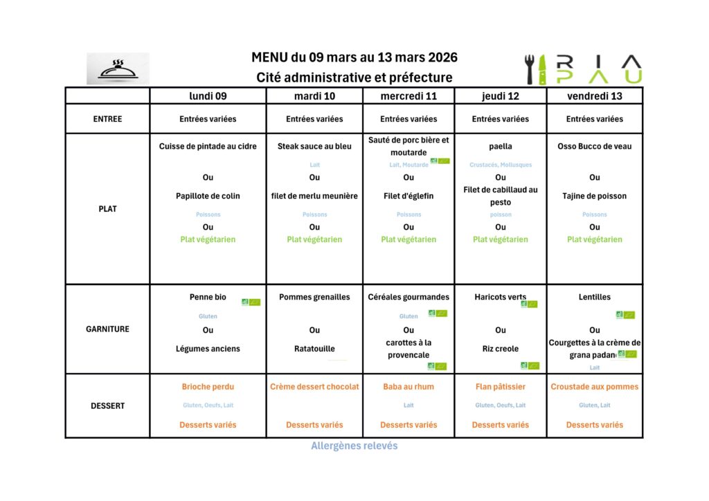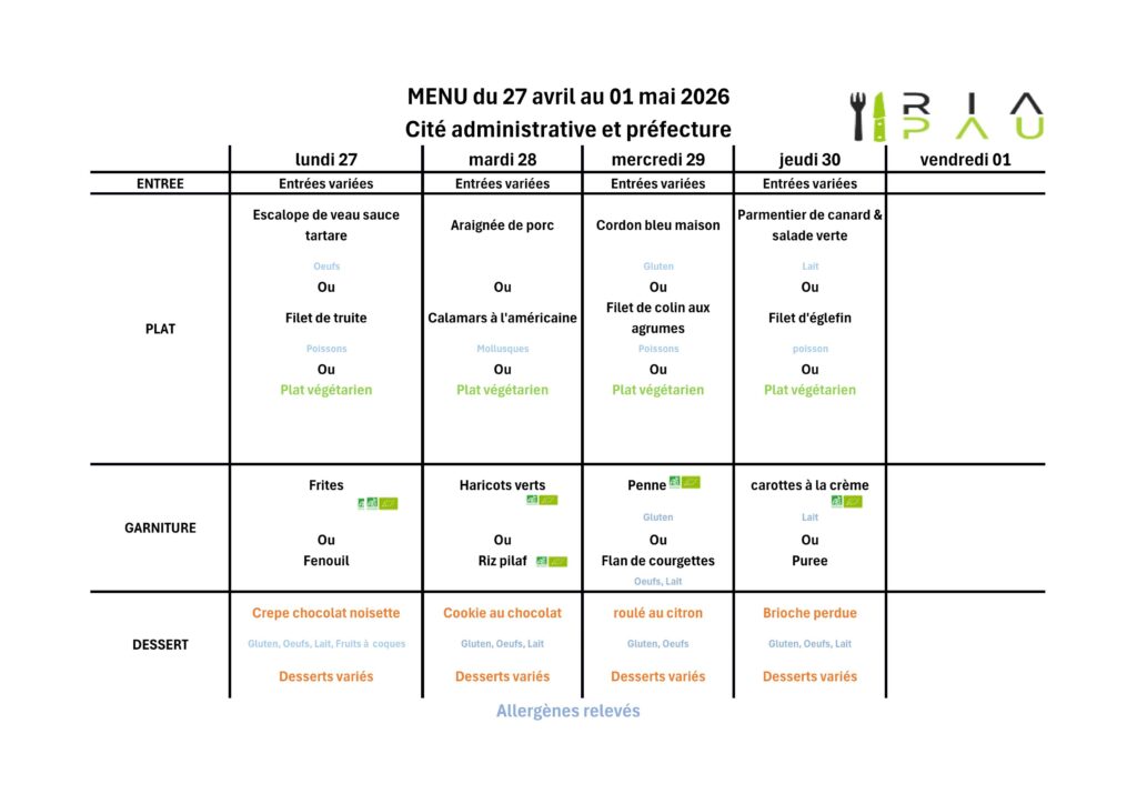 Menus du RIA (cité administrative et Préfecture)